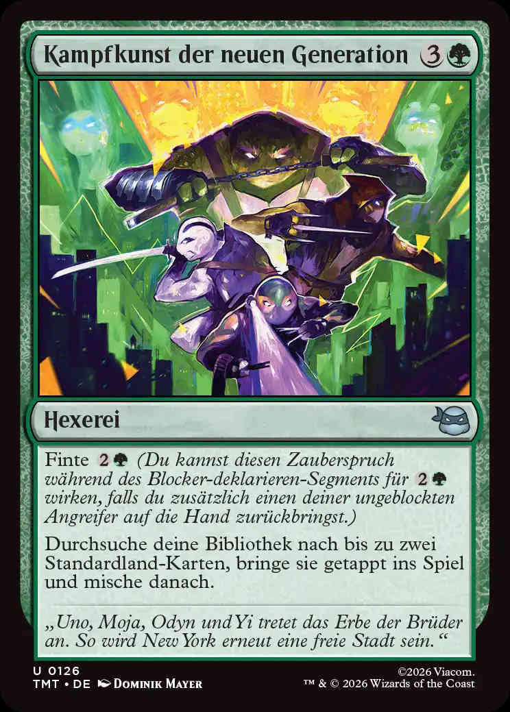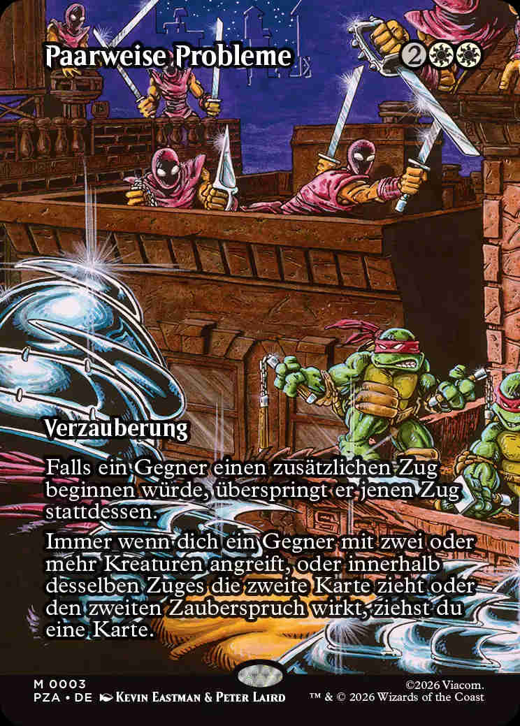 Willkommen zur Übersetzungswacht für Magic: The Gathering | Teenage Mutant Ninja Typos. Nach den menschlichen Spinnenhelden, die sich durch die Straßen von New York schwingen, sind nun die mutierten Ninjaschildkröten an der Reihe, in der Kanalisation der Stadt für Ordnung zu sorgen. Die Schildkröten machen dabei einen besseren Job als die Spinnen, denn gemessen an Fehlerquantität und –qualität ist die Kanalisation sauberer als die Straßen.
